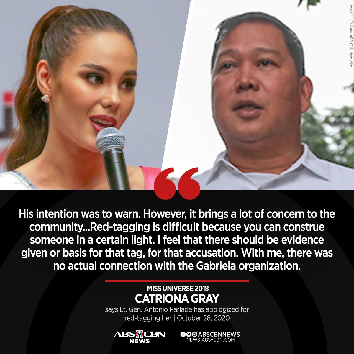 Abs Cbn News On Twitter Miss Universe Catriona Gray Said Ntf Elcac Spokesperson Lt Gen Antonio Parlade Has Already Apologized For Red Tagging Her Details To Follow On Https T Co Ezq6nlz498 Https T Co 0bxn5nltml